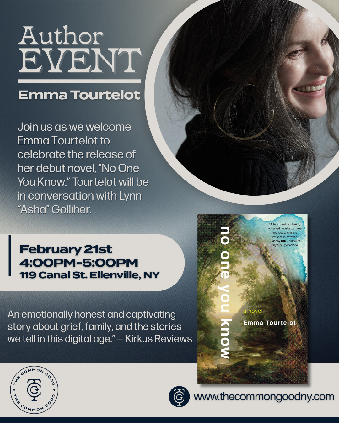 Back to All Events Author EVent: Emma Tourtelot Saturday, February 21, 2026 4:00 PM 5:00 PM The Common Good 119 Canal Street Ellenville, NY, 12428 United States (map) Google Calendar ICS